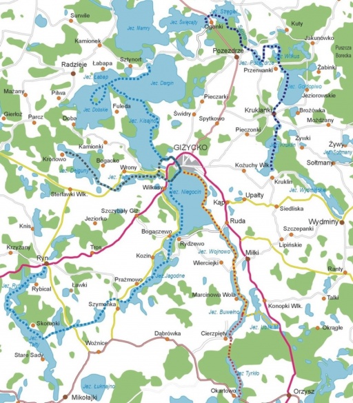 Jestli se rozhodnete k této cestě, budete vskutku moci ocenit krásu Giżycké země. Navrhujeme, abyste jí věnovali několik dnů. Začínáme v městě Ryn, odkud jezerem Ryńskym plujeme směrem na jih až do jezera Tałty. Držíme se levého břehu až uvidíme Tałcký kanál, kterým se dostaneme na jezero Tałtowisko. Je to 14-ti kilometrová cesta. Pokračujeme jezerem napříč, míjíme zátoku a dědinu Zielony Gaj. Dále nás Mioduńský kanál zavede do obce Szymonka. Je tady možnost noclehu a doplnění zásob. Od jezera Szymoneckého směřujeme na sever k jezeru Jagodne a po 7 kilometrech už jsme u kanálu Kula. Dalším orientačním bodem je jezero Boczne. Po pravé straně tohoto jezera vidíme turistickou osadu Rydzewo. Z jezera Boczne se už dostaneme na jezero Niegocin a do Giżycka už máme jen 8 kilometrů. Navrhujeme, abyste se drželi levého břehu. Proplujeme kolem obce Wilkasy a doplouváme k Giżycku. Pokračujeme Łuczańským kanálem a jsme na jezeře Kisajno. Je tam mnoho ostrovů, kde se nachází přírodní rezervace chránící vodní ptáky. Plujeme u pravého břehu a po 10 kilometrech se dostaneme k poloostrovu Królewski Róg. Navrhujeme namířit na z dálky viditelný poloostrov Fuledzki Róg, minout ho a vyplout na jezero Dobskie, které je útočištěm kormoránů. Z jezera Dobského se vracíme na otevřené vody jezera Dargin, a odtud můžeme namířit k Węgorzewu nebo se vrátit podél břehu do Giżycka.