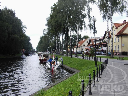 Nadbrzezna Street, where the Canal marks with Lake Niegocin – walk on the pavement along the Canal and head north, pass by the 14th century Post Teutonic Castle on the left side and the swing bridge over Canal – keep straight along the Canal, pass by the dock of the Masurian Shipping Company renovating shipyard – pass by the gardens' area – go under the road-bridge, the Canal turns left, after walking under the second bridge go up and turn left – go straight to Wojska Polskiego Avenue and get to the roundabout – go through, get to the Moniuszki Street and then turn left – go towards downtown.